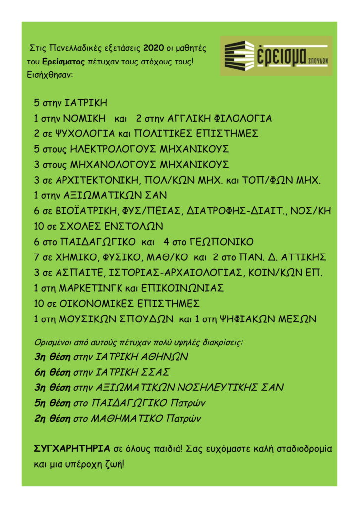 Αποτελέσματα Πανελλαδικών εξετάσεων 2020 You Might Also Like Πανελλαδικές 2025, μέγιστα μόρια 17 Αυγούστου, 2025 Γιατί να διαβάσω; 10 Μαρτίου, 2025 Σεμινάριο επαγγελματικού προσανατολισμού στο Έρεισμα! 16 Μαρτίου, 2022